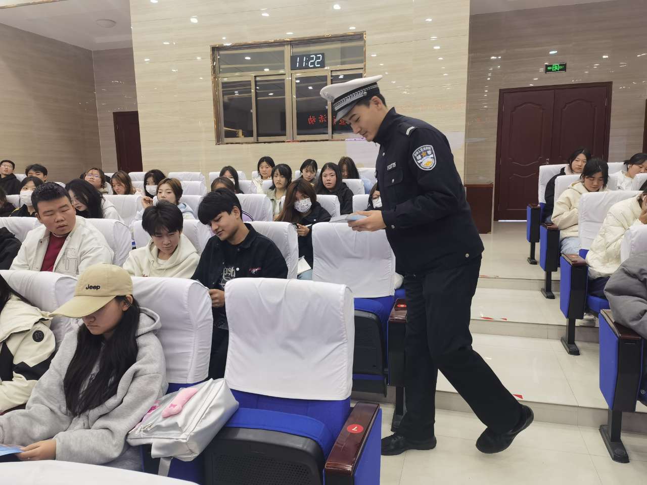 宣講中,王警官從步行、騎車、乘車、駕車等師生日常出行方式需要注意的交通安全事項(xiàng)出發(fā),生動(dòng)而詳盡地向同學(xué)們講授各種實(shí)用的交通安全知識(shí)。通過案例分析、警示視頻播放等方式,講解“開門殺”“鬼探頭”“酒駕”“不佩戴安全頭盔”等安全隱患的危害,支招“荷式開門法”等正確下車操作方式化解“開門殺”等安全隱患,讓同學(xué)們?cè)谡鎸?shí)交通事故警示視頻中直觀地認(rèn)識(shí)到交通事故的慘烈性、危害性,使同學(xué)們深刻認(rèn)識(shí)到不遵守交通規(guī)則的嚴(yán)重后果。最后,通過發(fā)放宣傳資料并結(jié)合學(xué)生出行特點(diǎn)及學(xué)校周邊道路交通環(huán)境等實(shí)際情況,讓學(xué)生注意“視線盲區(qū)”等危險(xiǎn),讓學(xué)生銘記“寧等三分,不搶一秒”文明禮讓通行警語。