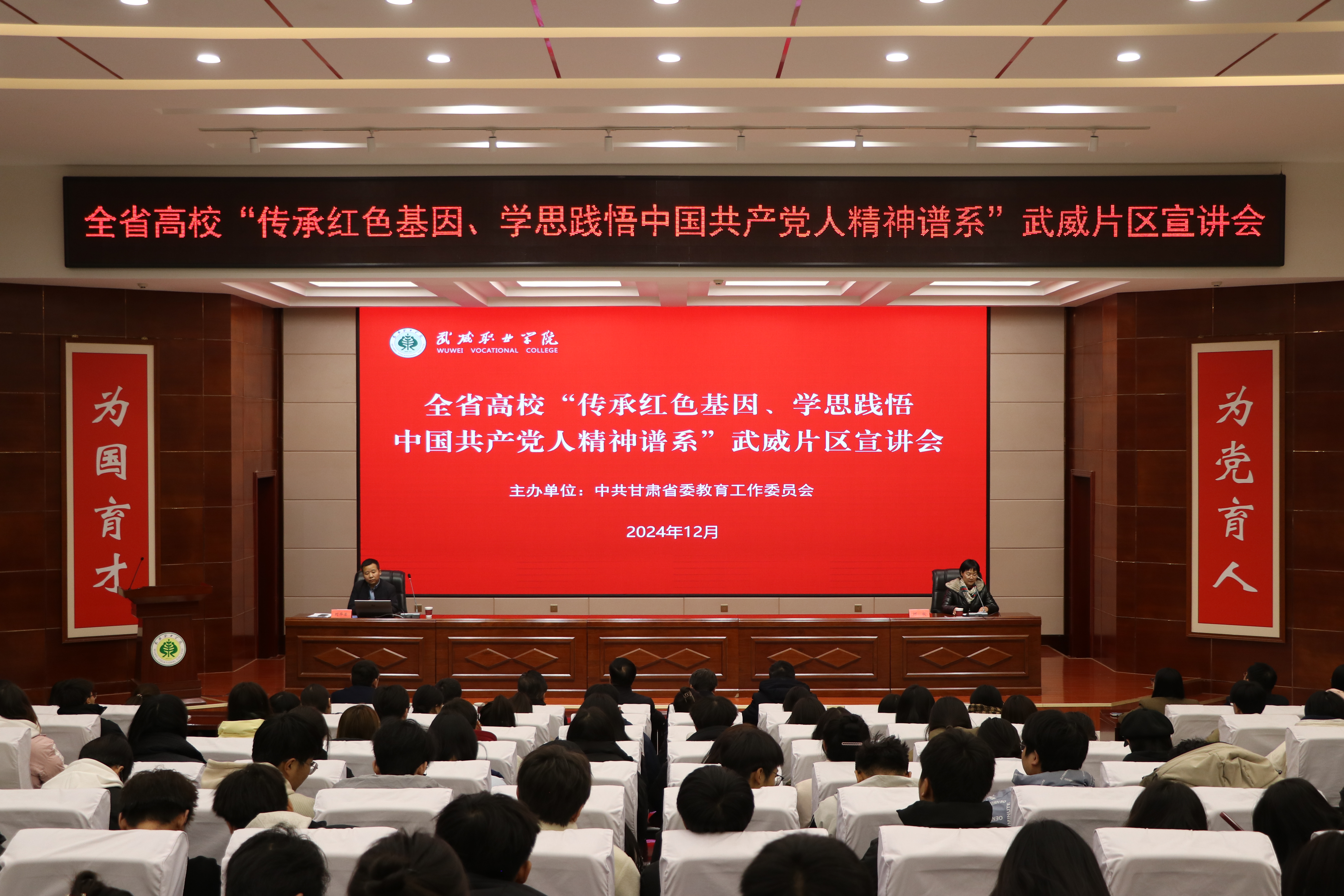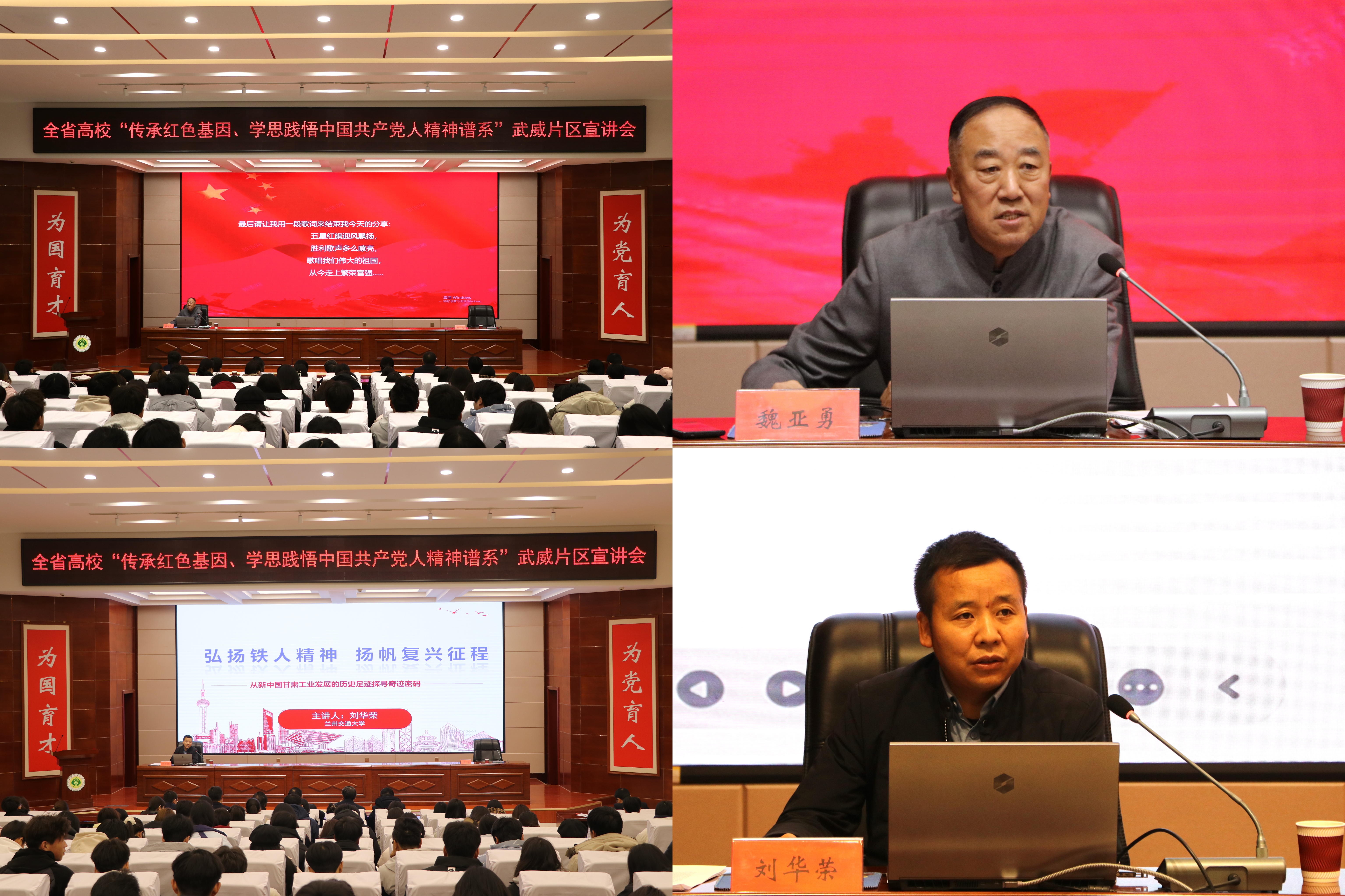 12月12日,由省委教育工委主辦,我校牽頭承辦的全省高?!皞鞒屑t色基因、學(xué)思踐悟中國(guó)共產(chǎn)黨人精神譜系”武威片區(qū)宣講會(huì)順利舉行。張掖市忠孝文化研習(xí)會(huì)會(huì)長(zhǎng)魏亞勇、蘭州交通大學(xué)馬克思主義學(xué)院副院長(zhǎng)劉華榮結(jié)合個(gè)人經(jīng)歷,聚焦紅色文化、鐵人精神等開展示范宣講。甘肅畜牧工程職業(yè)技術(shù)學(xué)院和我校師生代表共計(jì)200人聆聽了宣講。宣講會(huì)由黨委委員、副校長(zhǎng)何毅主持。