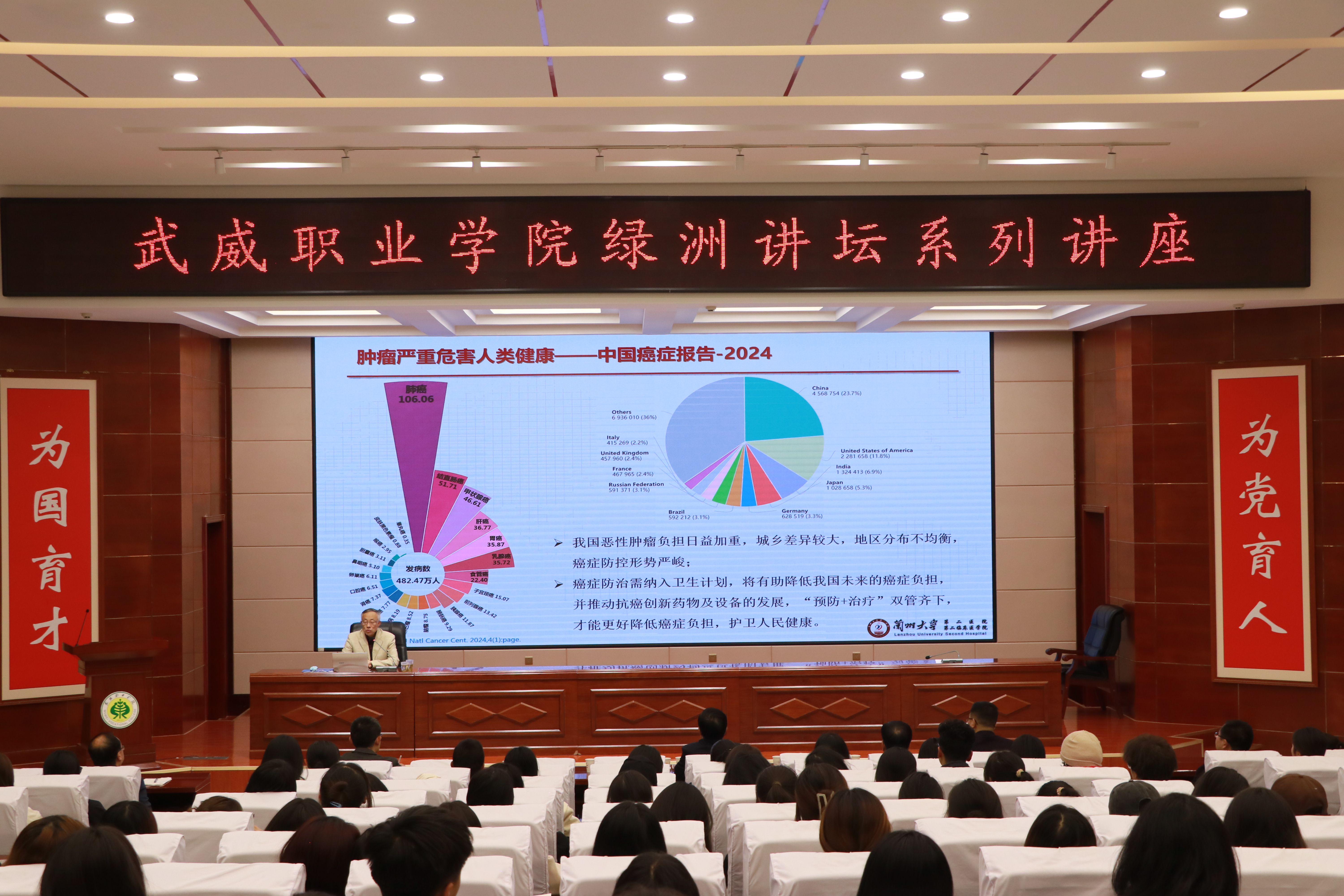 報(bào)告會(huì)由學(xué)校校長、黨委副書記張開禮主持,特邀蘭州大學(xué)第二醫(yī)院王志平教授作了“腫瘤臨床放射治療的過去、現(xiàn)在和未來與人才”的主題講座,甘肅省武威醫(yī)學(xué)科學(xué)院腫瘤醫(yī)院醫(yī)護(hù)人員代表、蘭州大學(xué)實(shí)習(xí)生代表和學(xué)校師生代表共計(jì)220余人參加了報(bào)告會(huì)。