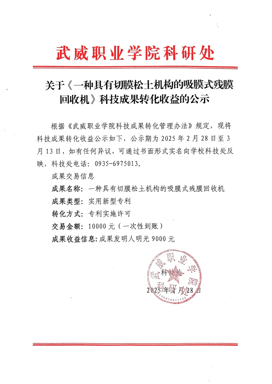 關(guān)于《一種具有切膜松土機(jī)構(gòu)的吸膜式殘膜回收機(jī)》科技成果轉(zhuǎn)化收益的公示