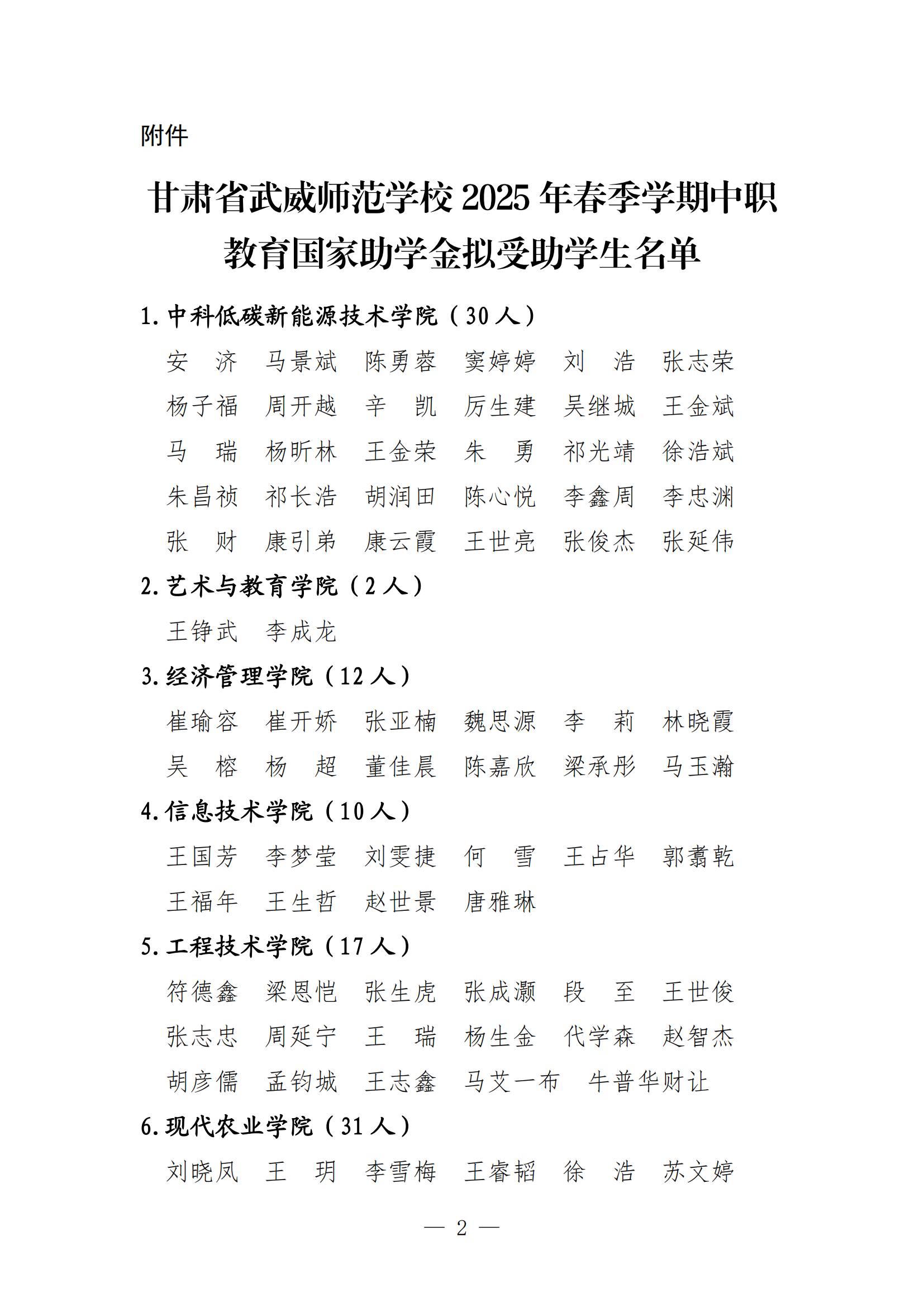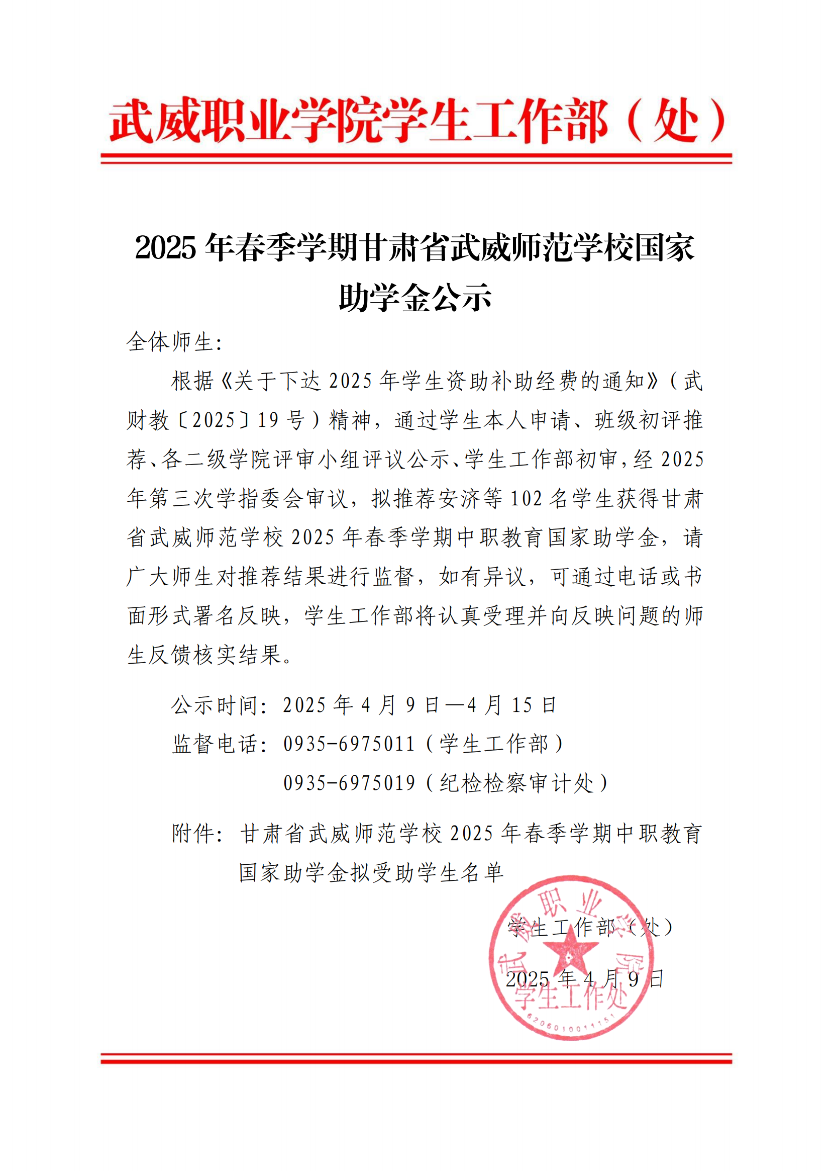 甘肅省武威師范學(xué)校關(guān)于2024-2025學(xué)年中職國(guó)家獎(jiǎng)學(xué)金候選人的公示