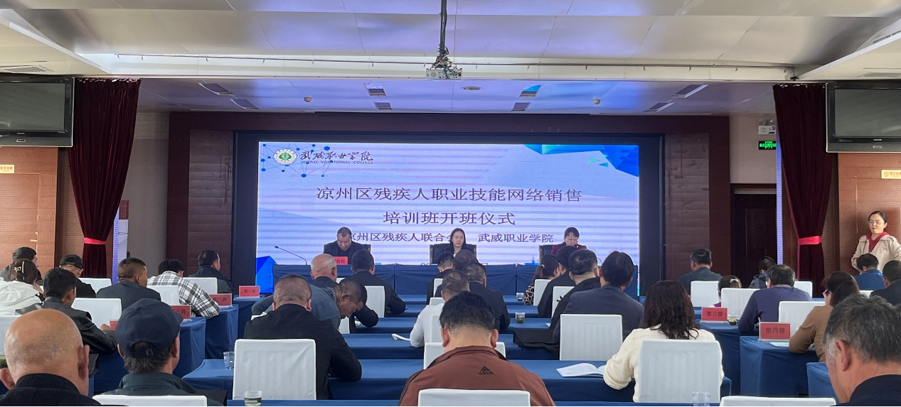 ?????? 4月22日下午,由涼州區(qū)殘疾人聯(lián)合會主辦,學校承辦的涼州區(qū)殘疾人職業(yè)技能網(wǎng)絡銷售培訓班順利開班,來自涼州區(qū)的90名殘疾人學員參加了本次培訓學習。涼州區(qū)殘聯(lián)副理事長張家燕,學校黨委委員、副校長田迎春,藥學院黨總支書記蔡柱山出席開班儀式。
