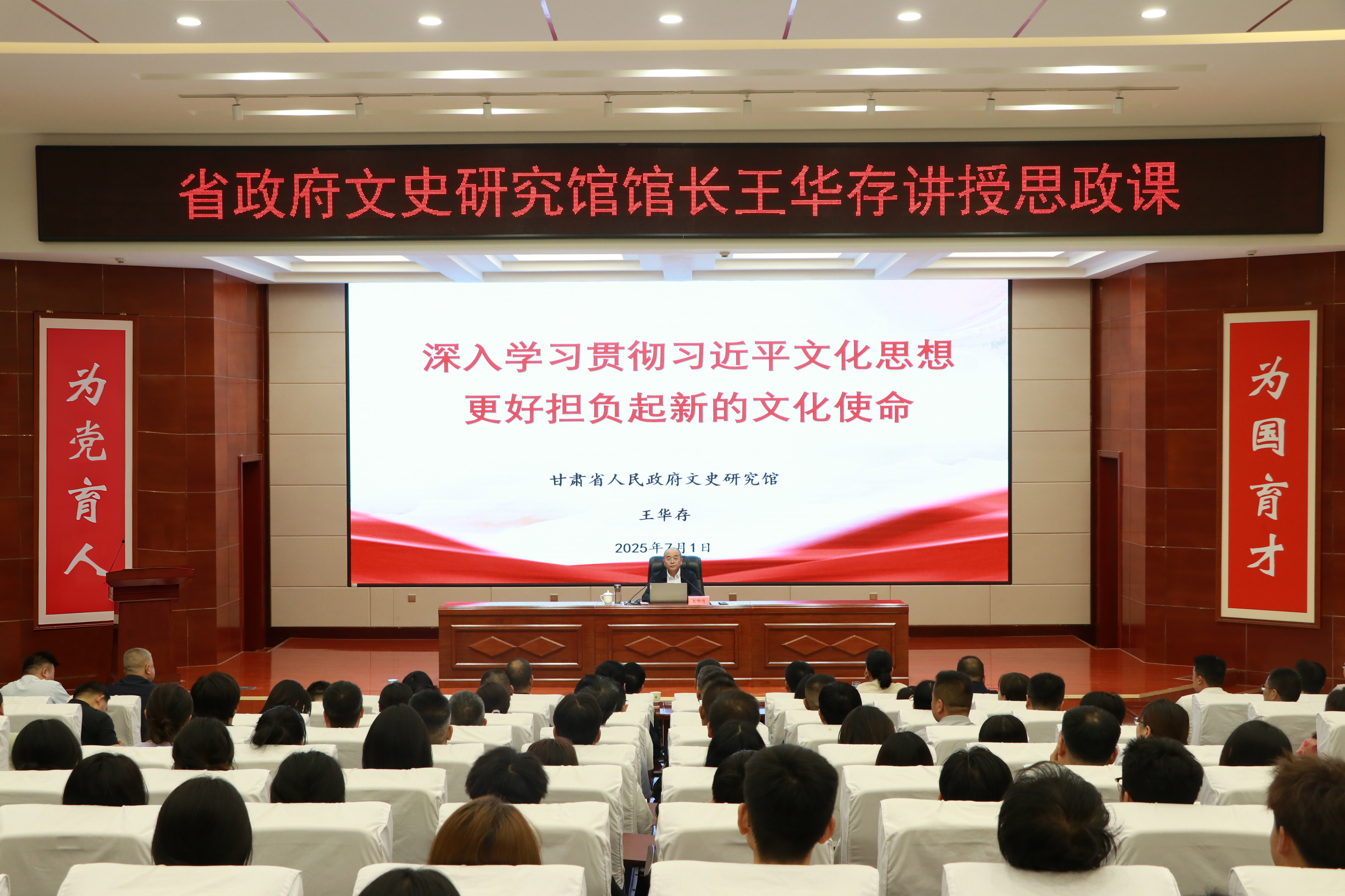 7月1日,在全校上下喜迎中國共產(chǎn)黨成立104周年之際,甘肅省人民政府文史研究館黨組書記、館長王華存到學(xué)校為師生講授思想政治理論課。王華存以“深入學(xué)習(xí)貫徹習(xí)近平文化思想 更好擔(dān)負起新的文化使命”為題,從深刻認識習(xí)近平文化思想的形成過程、習(xí)近平文化思想的豐富內(nèi)涵和核心要義、甘肅文化歷史簡述、當(dāng)代青年如何更好擔(dān)當(dāng)起新的文化使命四個方面對習(xí)近平文化思想進行了全面解讀。黨委書記王宏主持,學(xué)校領(lǐng)導(dǎo)、中層管理干部及師生代表共200余人到場聆聽。