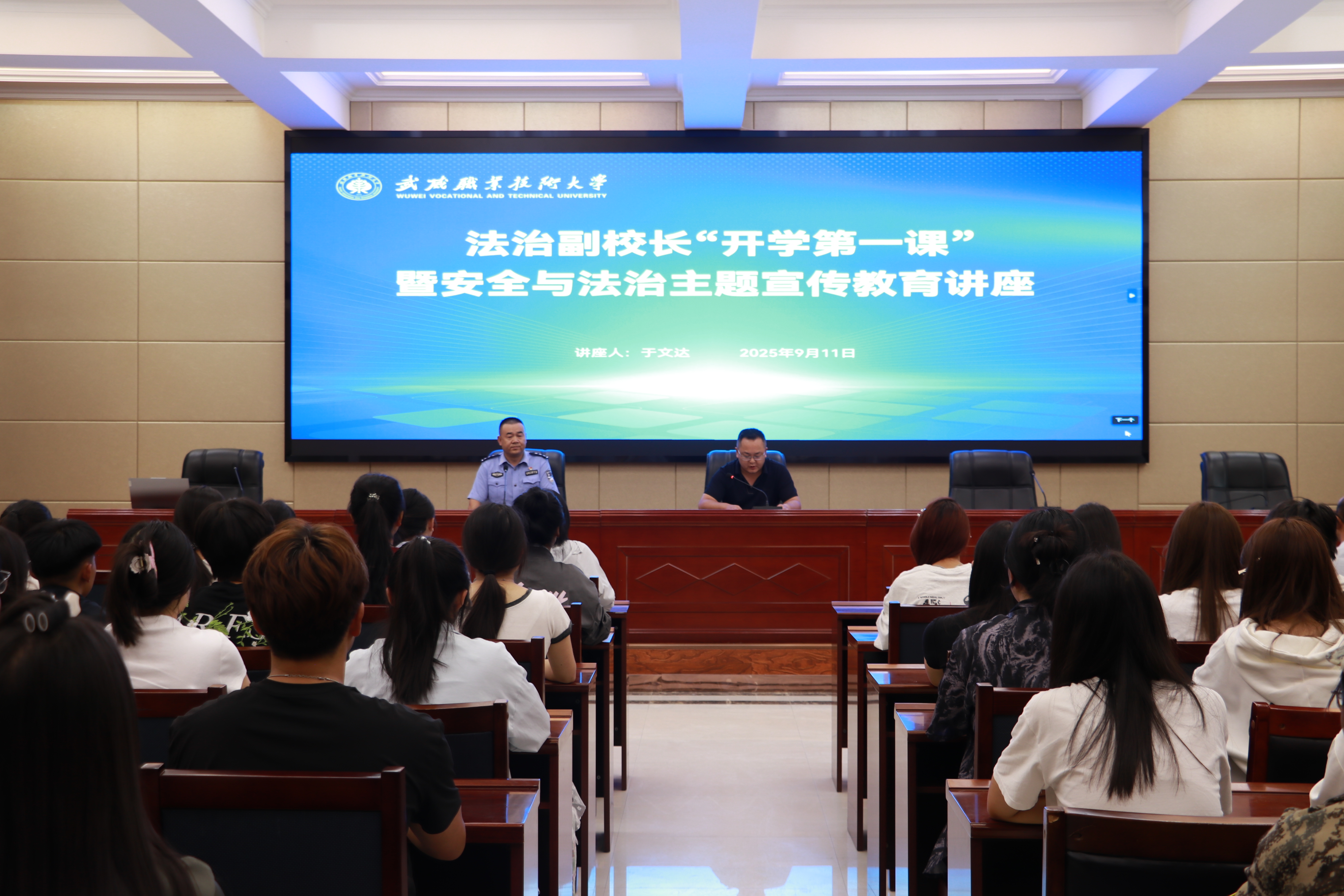 為加強師生法治觀念,提高安全意識,9月11日,學校安全保衛(wèi)處邀請法治副校長于文達為學校師生講授2025年秋季學期“開學第一課”,開展安全與法治教育專題講座?;顒釉谛袠錁潜眰?cè)報告廳舉行,活動由安全保衛(wèi)處副處長康興奎主持。