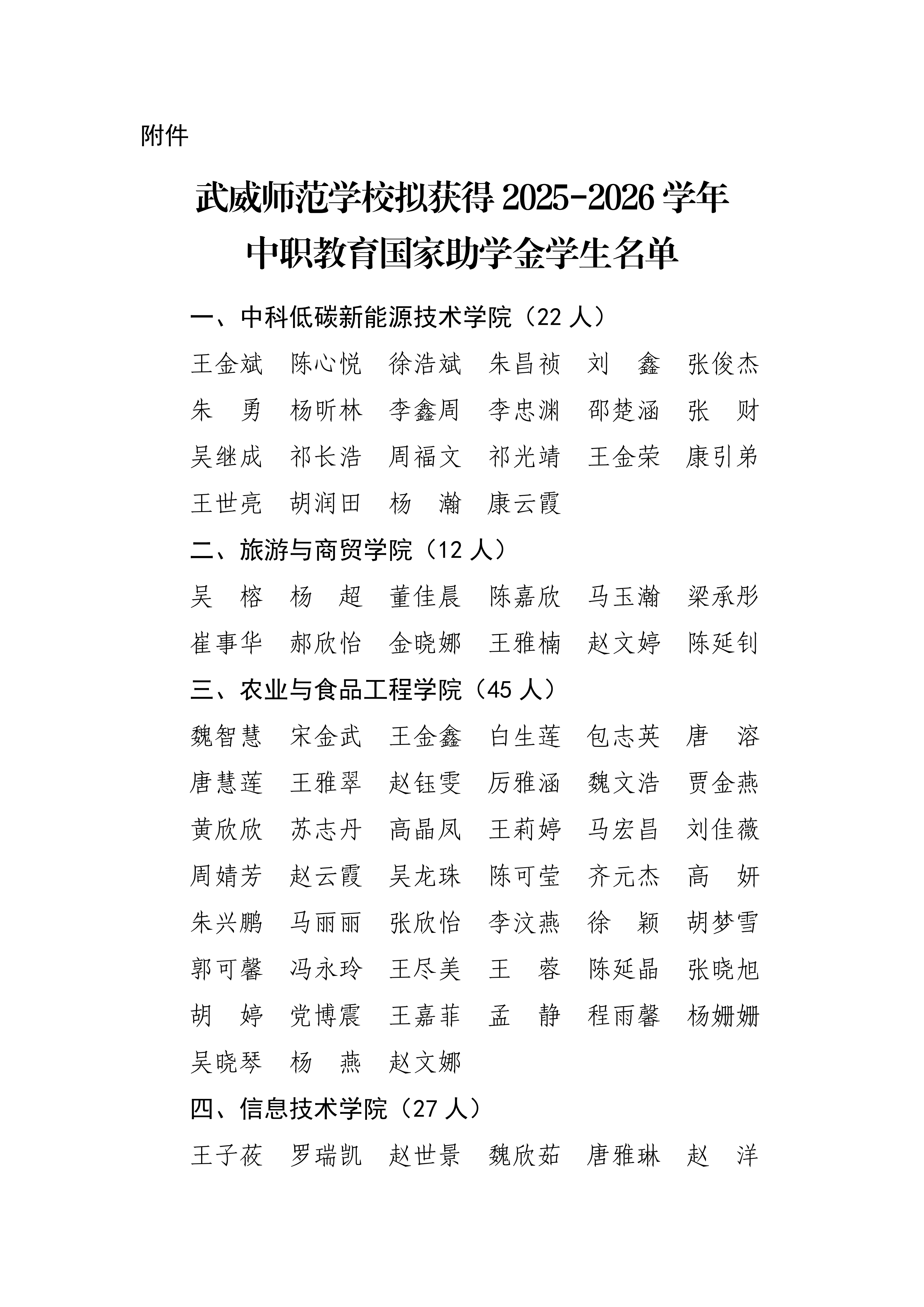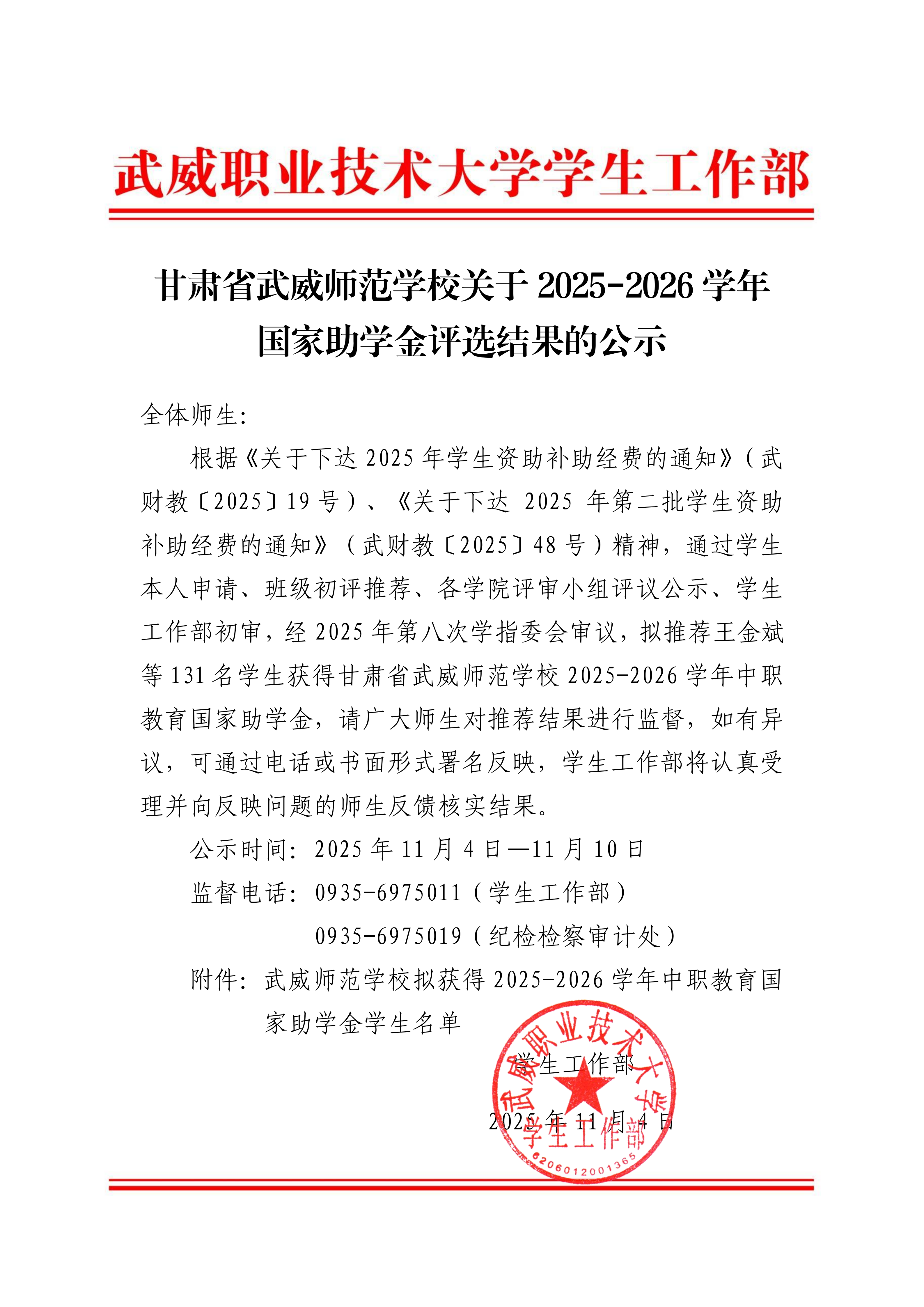 甘肅省武威師范學校關于2025-2026學年國家助學金評選結(jié)果的公示