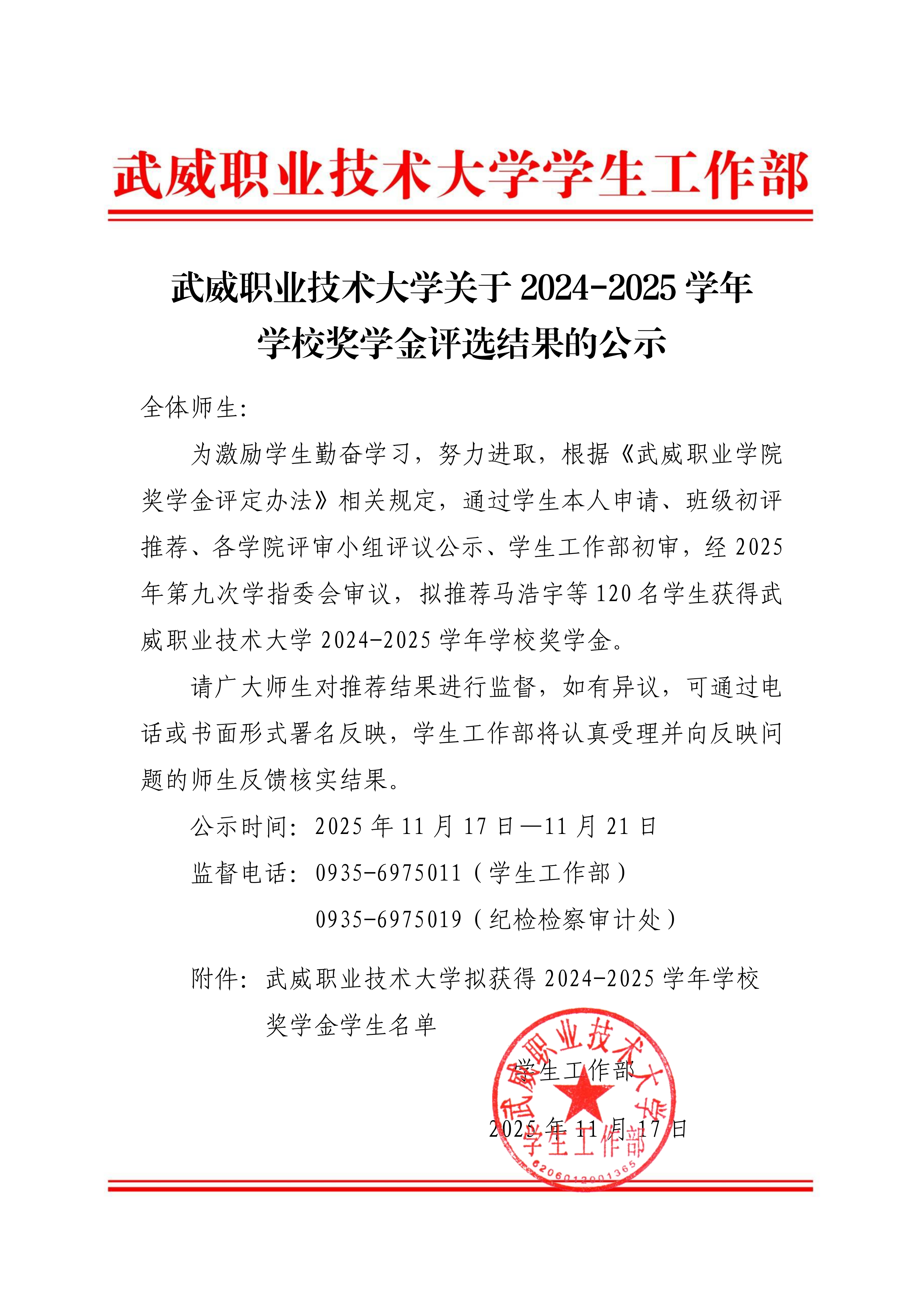武威職業(yè)技術(shù)大學關(guān)于2025年學校助學金評選結(jié)果的公示