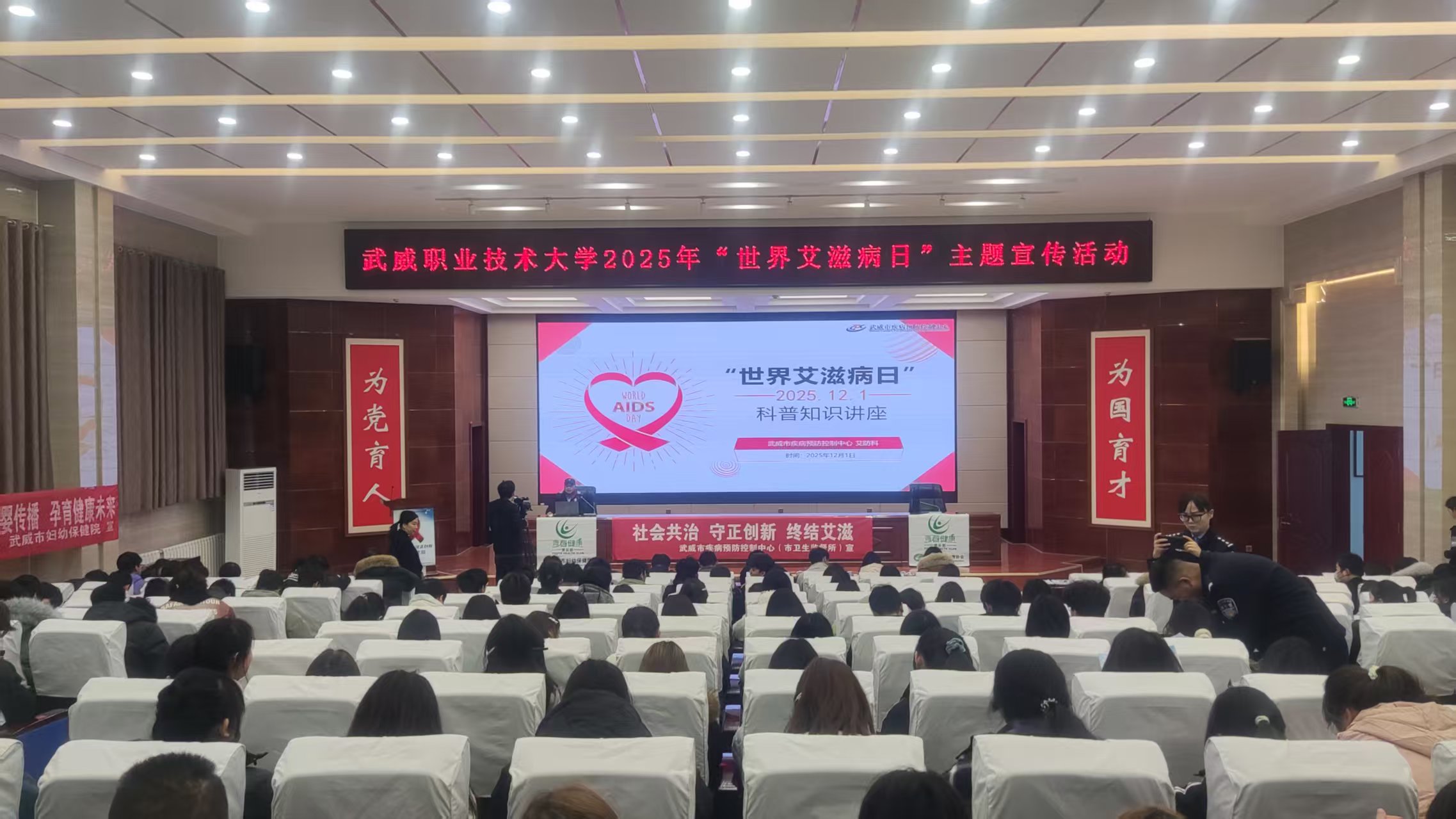 當(dāng)天的主題宣傳活動(dòng)內(nèi)容豐富,形式多樣?;顒?dòng)伊始,“知艾防艾”專題講座在菁英廳率先開講。講座特邀武威市疾病預(yù)防控制中心艾防科負(fù)責(zé)人王向尚與武威市人民醫(yī)院的皮膚科副主任醫(yī)師李杉擔(dān)任主講嘉賓。專家們結(jié)合一線工作實(shí)際經(jīng)驗(yàn),用翔實(shí)的數(shù)據(jù)和鮮活的案例,生動(dòng)講解了艾滋病的傳播途徑、預(yù)防措施、流行現(xiàn)狀以及反歧視理念,內(nèi)容深入淺出,貼近學(xué)生實(shí)際,有效幫助大家樹立起正確的防艾觀念,消除對(duì)艾滋病感染者的誤解與恐懼。