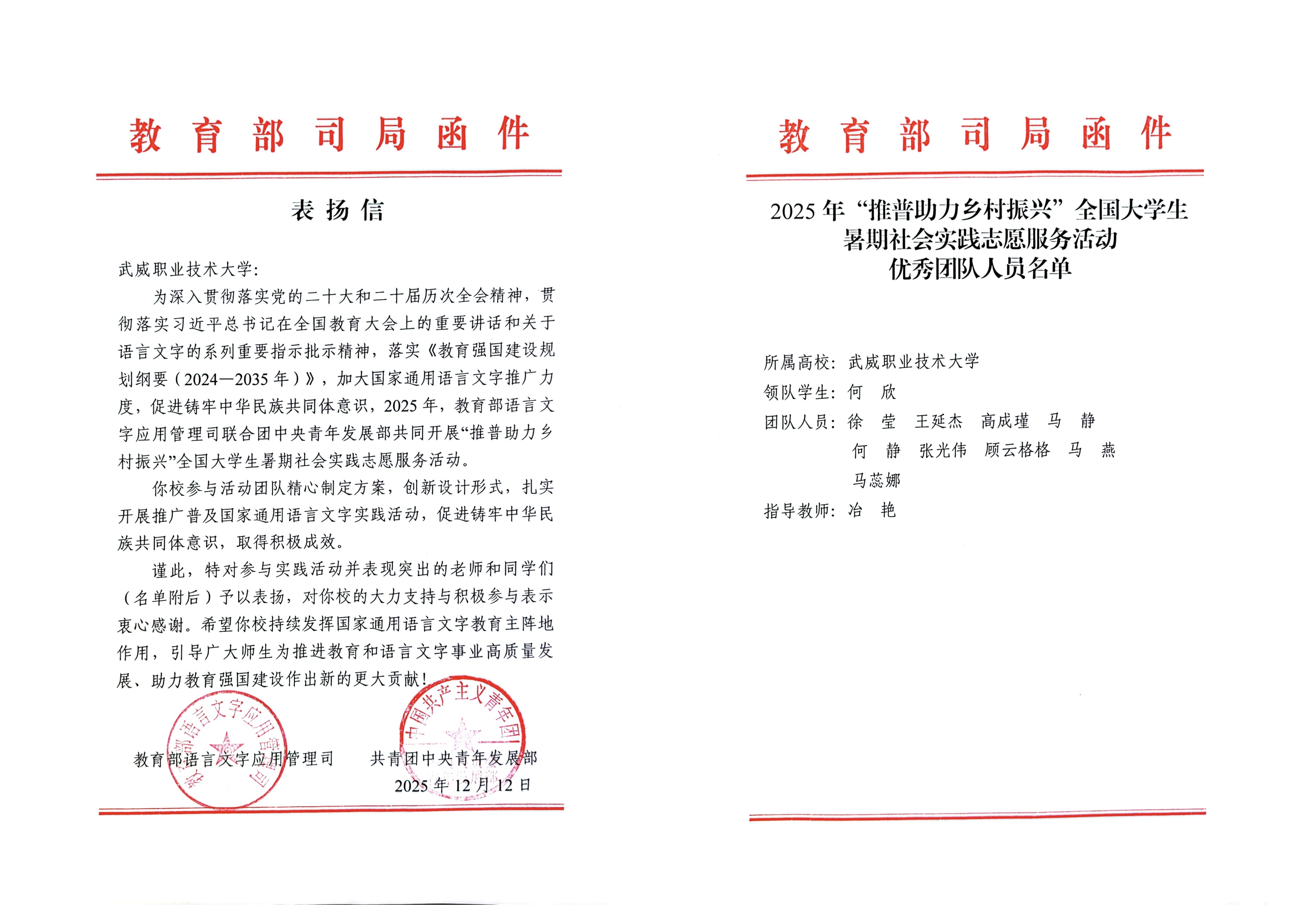 喜報(bào)!武威職業(yè)技術(shù)大學(xué)“推普助力·鄉(xiāng)村振興”暑期社會(huì)實(shí)踐團(tuán)隊(duì)獲評全國優(yōu)秀團(tuán)隊(duì)