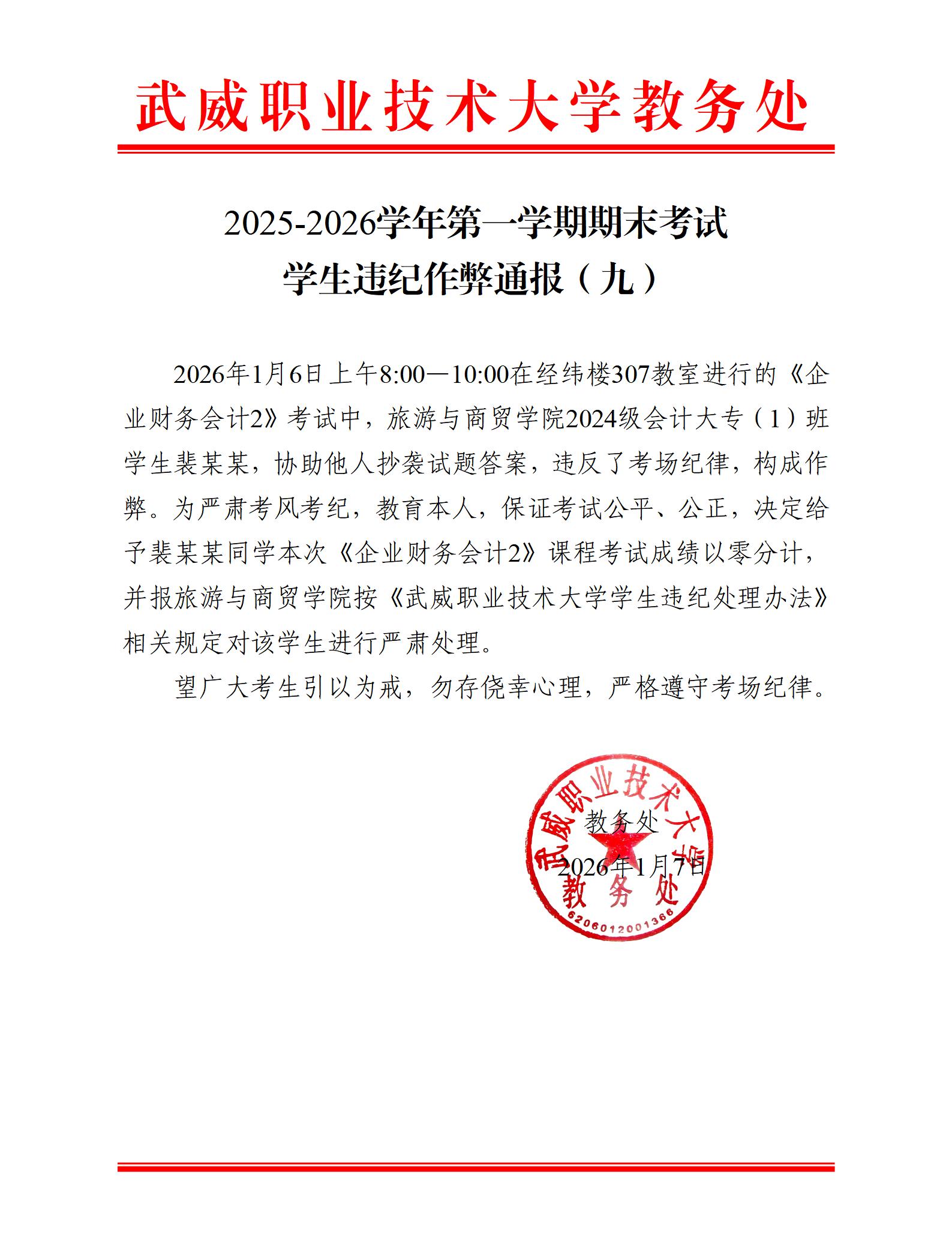 2025-2026學(xué)年第一學(xué)期期末考試學(xué)生違紀作弊通報(九)