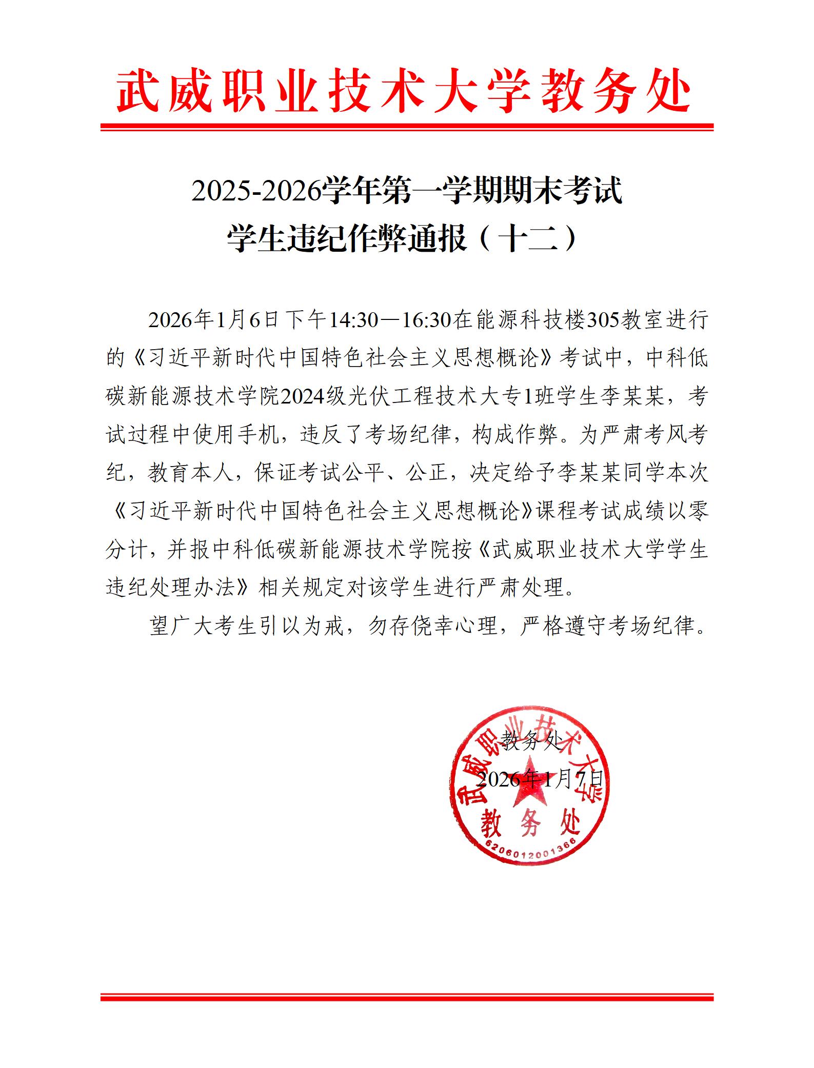 2025-2026學年第一學期期末考試學生違紀作弊通報(十二)