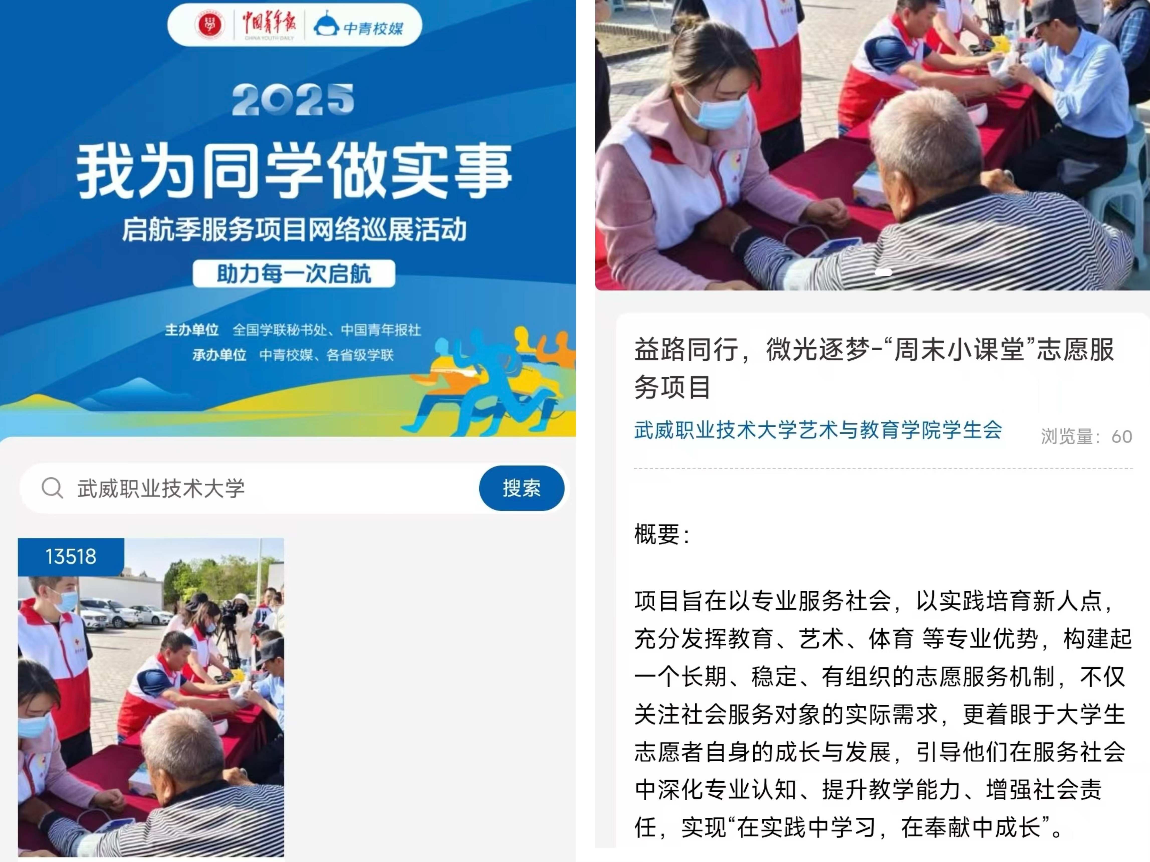 近日,由共青團(tuán)中央指導(dǎo),全國學(xué)聯(lián)秘書處與中國青年報(bào)、中青校媒聯(lián)合發(fā)起的全國高校學(xué)生會(huì)組織“我為同學(xué)做實(shí)事”啟航季服務(wù)項(xiàng)目網(wǎng)絡(luò)巡展活動(dòng)公布入選名單。藝術(shù)與教育學(xué)院學(xué)生會(huì)申報(bào)的“益路同行,微光筑夢(mèng)”周末小課堂服務(wù)項(xiàng)目從全國896所院校的1662個(gè)項(xiàng)目中脫穎而出。