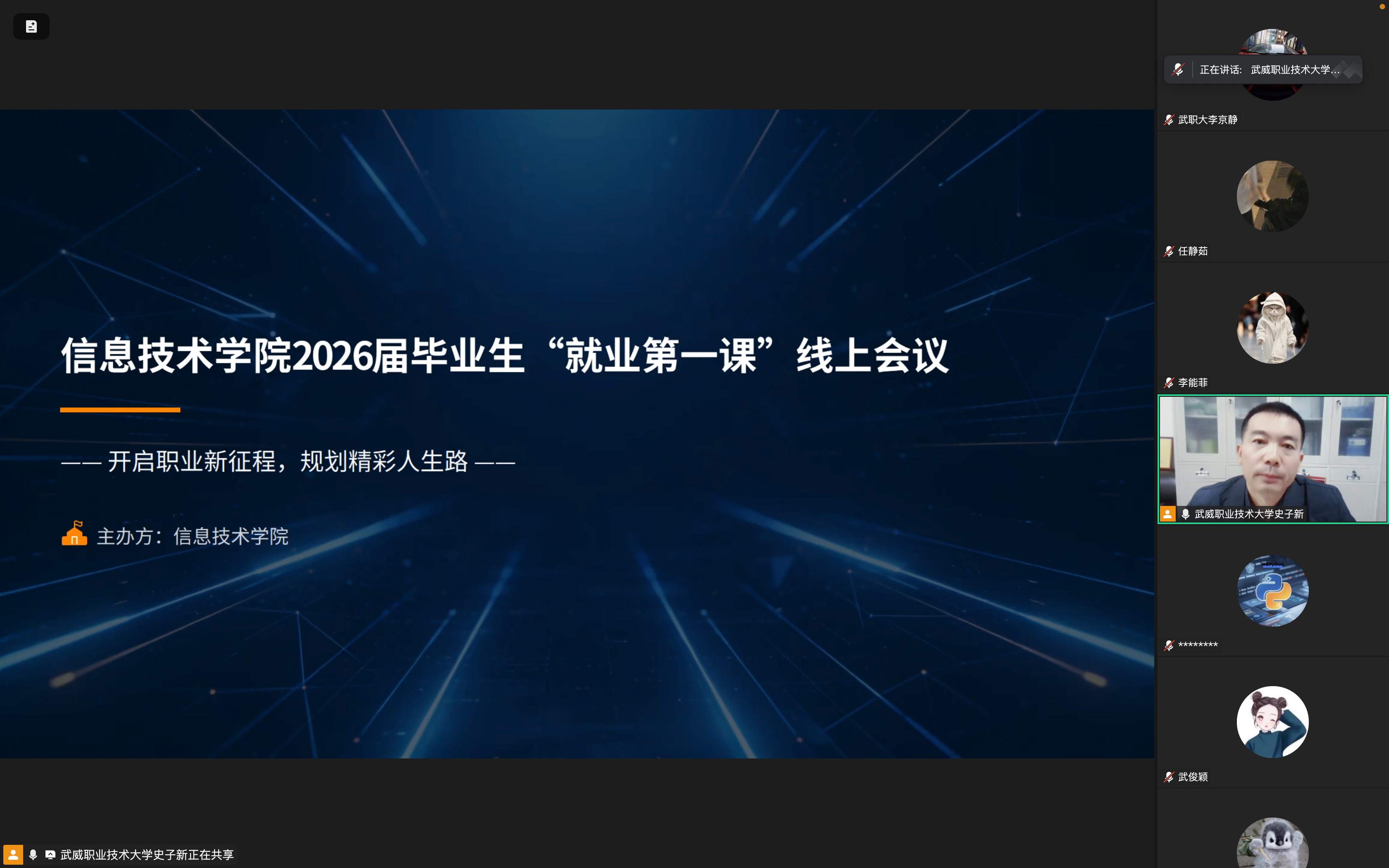 為深入貫徹落實高校“寒假促就業(yè)暖心行動”工作要求,切實做好2026屆畢業(yè)生就業(yè)指導服務,幫助實習階段的畢業(yè)生明晰職業(yè)方向、提升求職競爭力,3月5日,信息技術學院黨總支書記史子新通過“線下會場+線上同步直播”的形式,為全體2026屆畢業(yè)生及畢業(yè)班班主任開展了題為“開啟職業(yè)新征程,規(guī)劃精彩人生路”的“就業(yè)第一課”專題講座。
