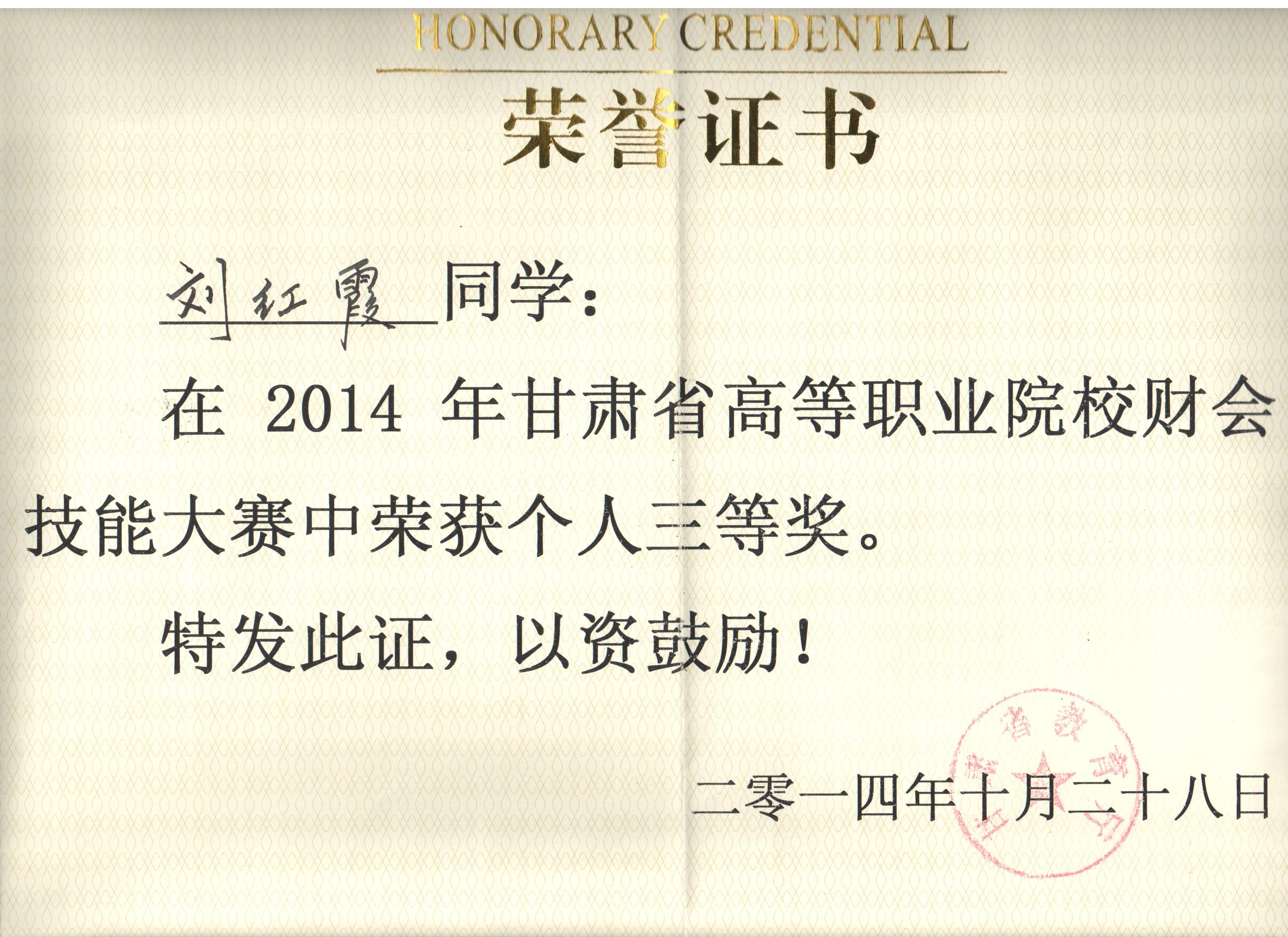 經(jīng)濟(jì)管理系李惠蘭、賀德赟老師指導(dǎo)我系會計(jì)專業(yè)學(xué)生參加2014年甘肅省高等職業(yè)學(xué)院財(cái)會技能大賽,榮獲優(yōu)秀獎。