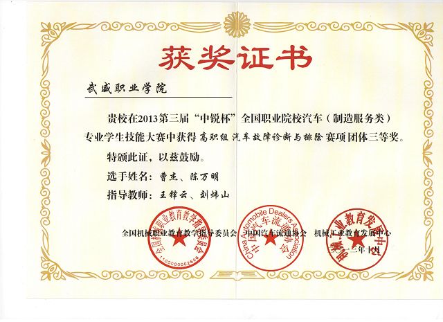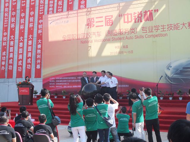 2013年101415日,第三屆“中銳杯”全國職業(yè)院校汽車(制造服務(wù)類)專業(yè)學(xué)生技能大賽”總決賽在江西南昌舉行。全國近百所院校三百多名學(xué)生參加了此次大賽。本次大賽由全國機械職業(yè)教育教學(xué)指導(dǎo)委員會、中國汽車流通協(xié)會、機械工業(yè)教育發(fā)展中心共同主辦,全國機械職業(yè)教育汽車類專業(yè)教學(xué)指導(dǎo)委員會、江西現(xiàn)代職業(yè)技術(shù)學(xué)院承辦。本次大賽裁判和評委均由汽車行業(yè)的各大代表以及資深企業(yè)營銷專家擔(dān)任,因此評選也將更加注重實踐性和專業(yè)性。