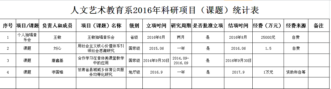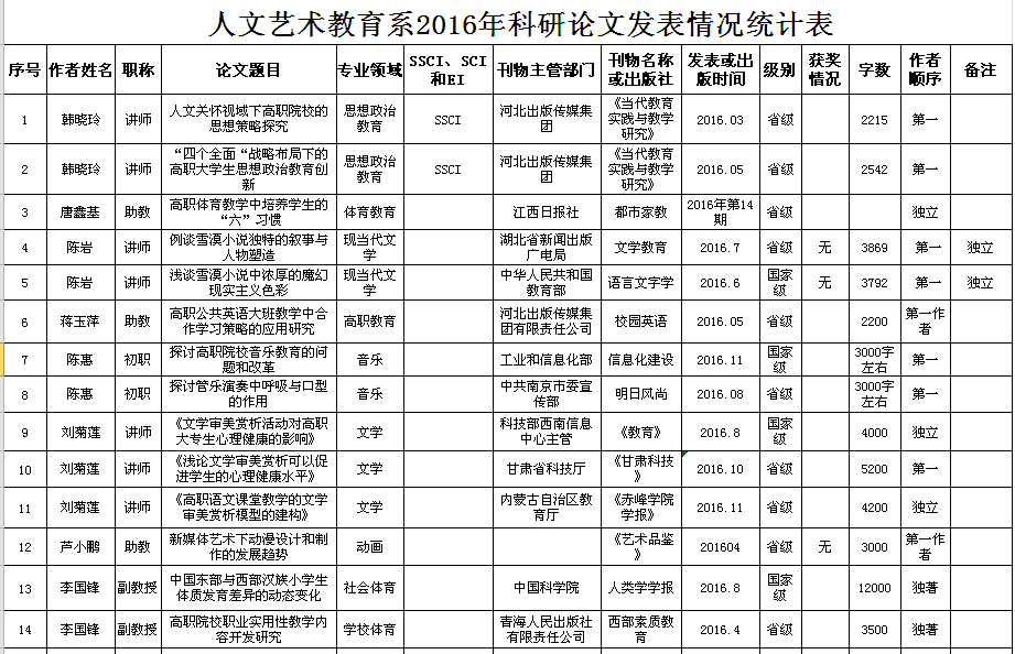 人文藝術(shù)教育系2016年科研成果統(tǒng)計