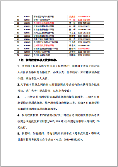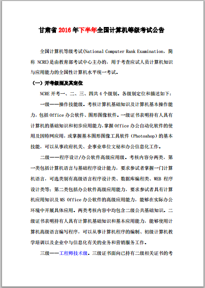 5.詳細信息請參看甘肅省教育考試院《關(guān)于做好2016年9月全國計算機等級考試網(wǎng)上報名工作的通知》(甘教考院〔2016〕95號文件)及《甘肅省2016下半年全國計算機等級考試公告》(已傳至群文件)。