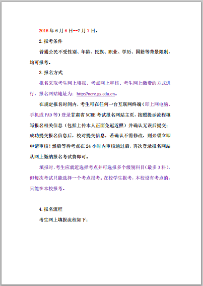 根據(jù)甘肅省教育考試院《關(guān)于做好2016年9月全國計算機等級考試網(wǎng)上報名工作的通知》(甘教考院〔2016〕95號文件)要求,2016年9月全國計算機等級考試(NCRE)將于2016年6月6日開始報名,全省統(tǒng)一實行網(wǎng)上報名。本次報名按照考生網(wǎng)上填報、考點網(wǎng)上審核、考生網(wǎng)上繳費的步驟進行?,F(xiàn)將有關(guān)安排及要求通知如下: