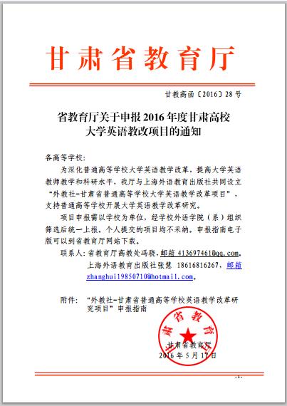 省教育廳關(guān)于申報2016年度甘肅高校大學英語教改項目的通知