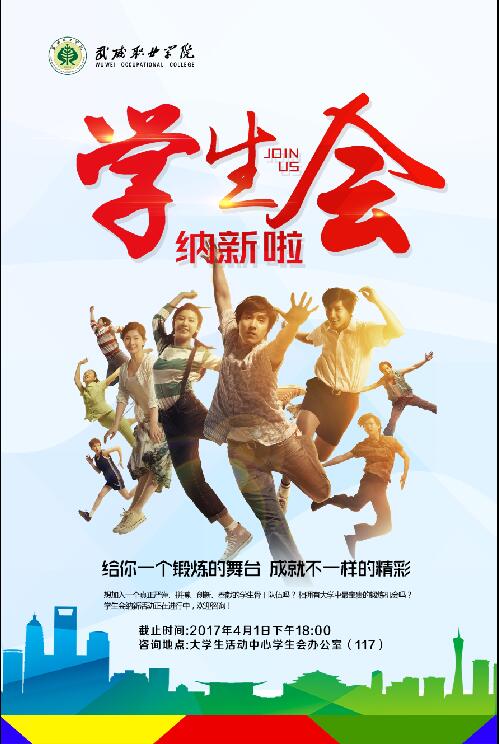武威職業(yè)學院學生會是在學院黨委領導下,院團委指導下,學生自發(fā)組織的群眾性學生組織。為進一步加強學院學生會隊伍建設,為廣大同學提供一個自我鍛煉的平臺,院團委研究決定面向2016級全體同學公開招聘學院學生會干部?,F(xiàn)將具體事宜通知如下: