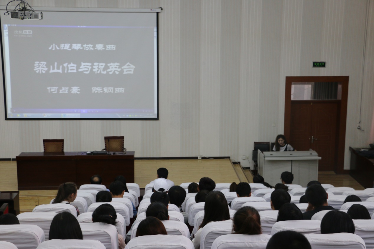 伴著優(yōu)美的音樂旋律王敏副教授開始了講座,王老師首先介紹了音樂發(fā)展歷史和音樂鑒賞的基礎(chǔ)知識(shí),然后以我國(guó)著名作曲家陳鋼、何占豪先生創(chuàng)作的小提琴協(xié)奏曲《梁山伯與祝英臺(tái)》為題材,分階段講述了“鳥語(yǔ)花香”、“草橋結(jié)拜”、“英臺(tái)抗婚”、“投墳化蝶”等內(nèi)容和藝術(shù)場(chǎng)景。剖析了作品在管樂、和以小提琴、大提琴為主的弦樂及民樂有機(jī)結(jié)合的高超藝術(shù)境界,講座過程中王老師結(jié)合《梁?!穮f(xié)奏曲音視頻資料,演繹了梁山伯與祝英臺(tái)凄美的愛情故事。