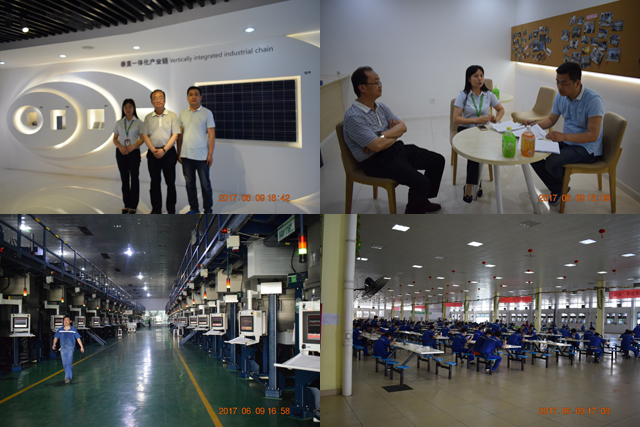 晶科能源控股有限公司是全球為數(shù)不多的擁有垂直一體化產(chǎn)業(yè)鏈的光伏制造企業(yè),業(yè)務(wù)涵蓋了優(yōu)質(zhì)的硅錠、硅片、電池片生產(chǎn)、高效單多晶光伏組件制造以及光伏電站建設(shè)等領(lǐng)域,是目前全球光伏組件生產(chǎn)的龍頭企業(yè),2016年中國500強(qiáng)企業(yè)。公司負(fù)責(zé)人帶領(lǐng)考察人員參觀了公司現(xiàn)代化的生產(chǎn)車間、晶科商學(xué)院、員工宿舍和食堂,介紹了公司的發(fā)展情況和用人需求。在考察過程中,考察人員就公司給學(xué)生提供的工作崗位、待遇、住宿、安全管理等情況與企業(yè)負(fù)責(zé)人進(jìn)行了深入交流。