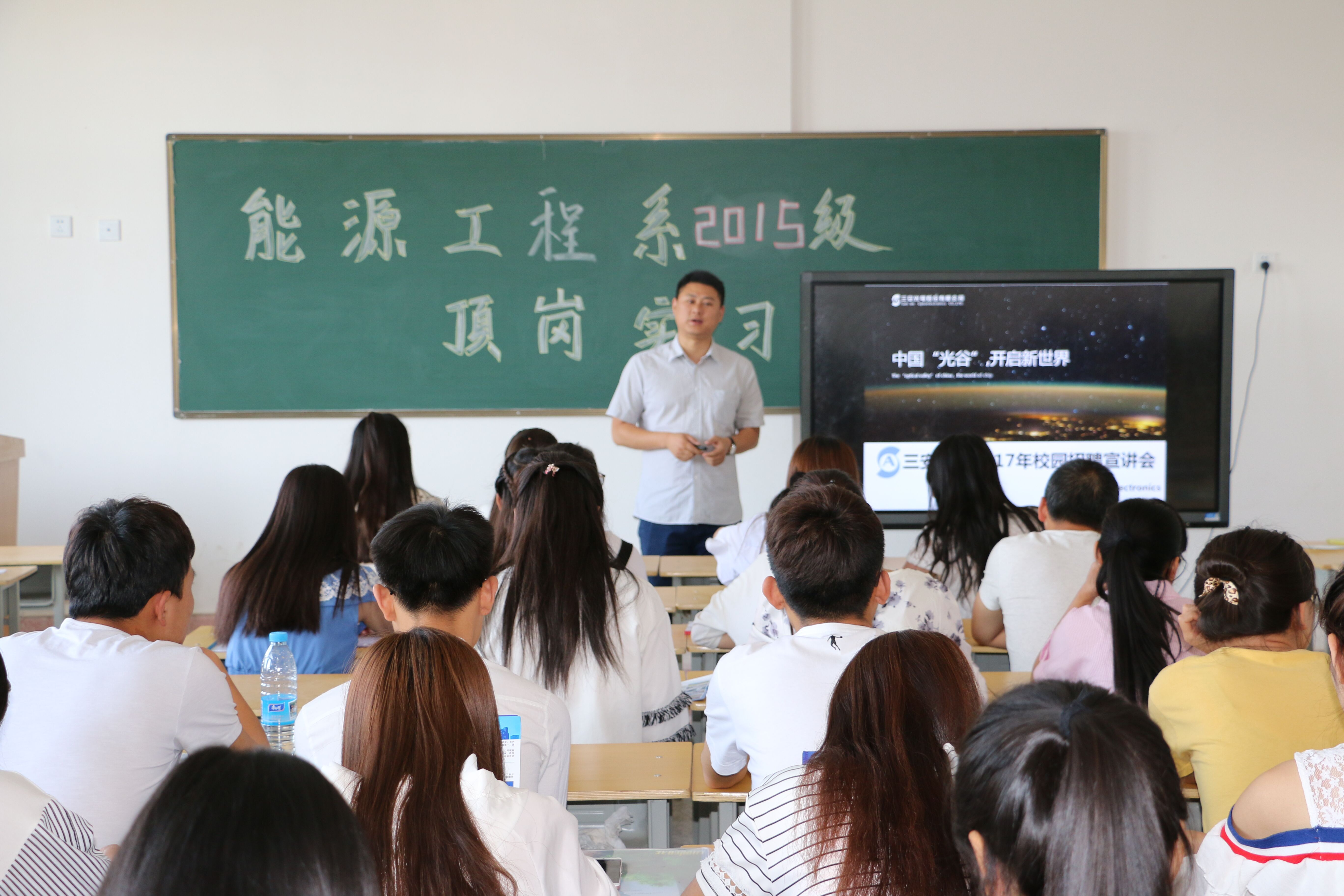 為進(jìn)一步深化校企合作,提供更優(yōu)質(zhì)的頂崗實(shí)習(xí)崗位,6月26日早上,能源工程系邀請校企合作企業(yè)安徽三安光電有限公司和晶科能源有限公司工作人員在我系洽談校企合作事宜,并對即將進(jìn)入實(shí)習(xí)的2015級學(xué)生做頂崗實(shí)習(xí)宣講。