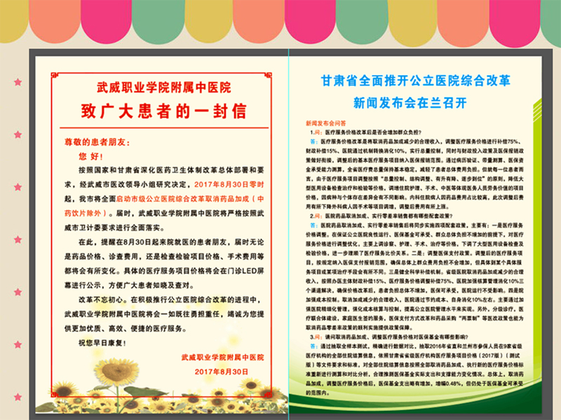 為了搞好公立醫(yī)院綜合改革,醫(yī)院加大對啟動公立醫(yī)院綜合改革工作的宣傳力度,通過醫(yī)院門診大廳LED屏幕、電子顯示屏、宣傳展架、宣傳彩頁及微信公眾號推送等多種方式擴(kuò)大醫(yī)院綜合改革宣傳,對患者及家屬做好正面引導(dǎo)工作,為醫(yī)院綜合改革任務(wù)的落實營造良好的氛圍。