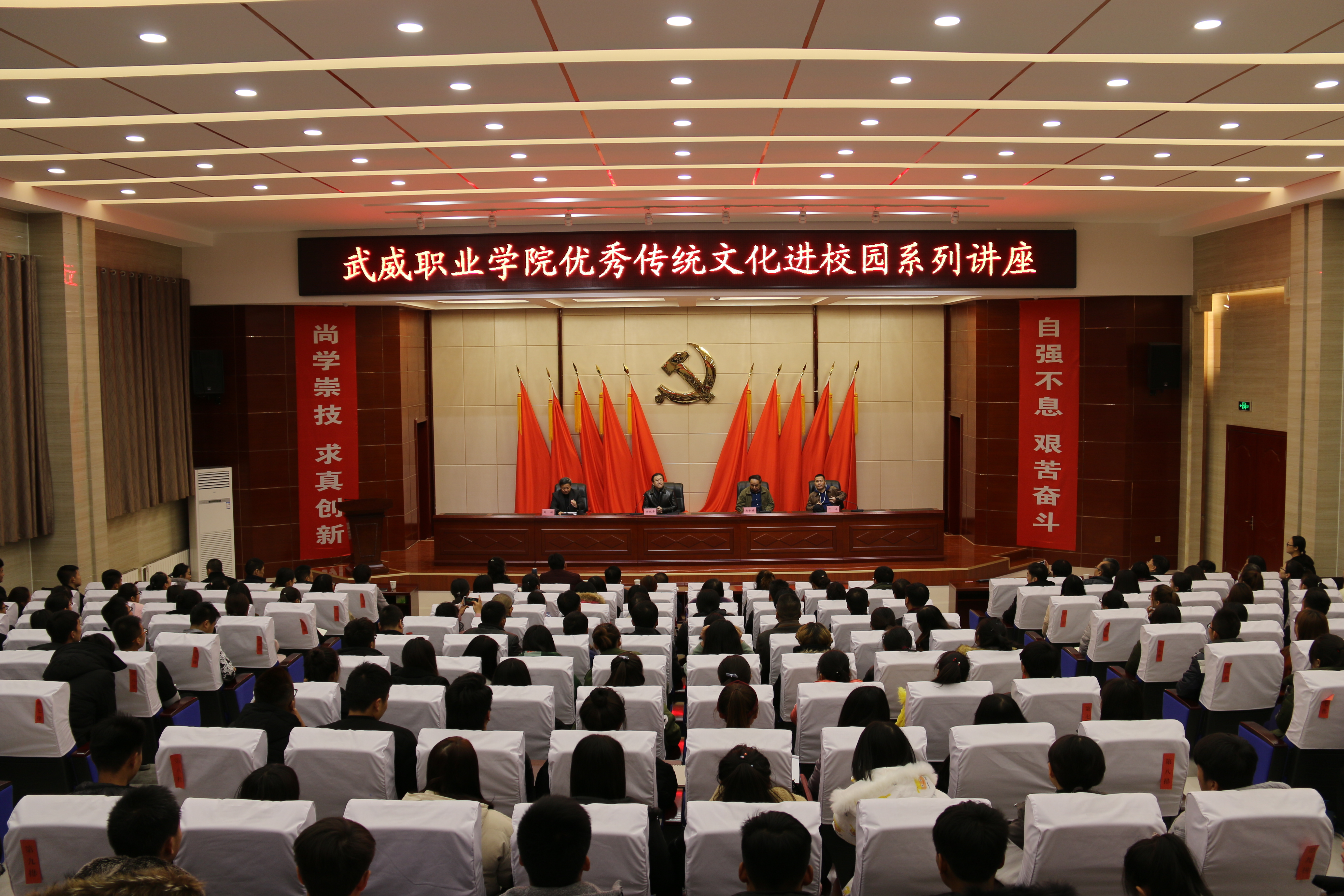 為貫徹落實《甘肅省實施中華優(yōu)秀傳統(tǒng)文化傳承發(fā)展工作方案》,推進優(yōu)質(zhì)高等職業(yè)院校的建設,加強傳統(tǒng)文化和校園文化相融合,提升校園文化軟實力,11月22日,學院在大學生活動中心菁英廳舉辦優(yōu)秀傳統(tǒng)文化進校園活動。活動邀請了西部著名作家、西北師范大學傳媒學院院長徐兆壽,甘肅省作家協(xié)會主席、甘肅省社科院文化研究所所長馬步升和甘肅省作協(xié)副秘書長、70后新銳作家弋舟三位學者以“鳩摩羅什與涼州文化”為主題進行了系列講座。學院黨委副書記趙明主持活動,學院師生共260余人聆聽了講座。